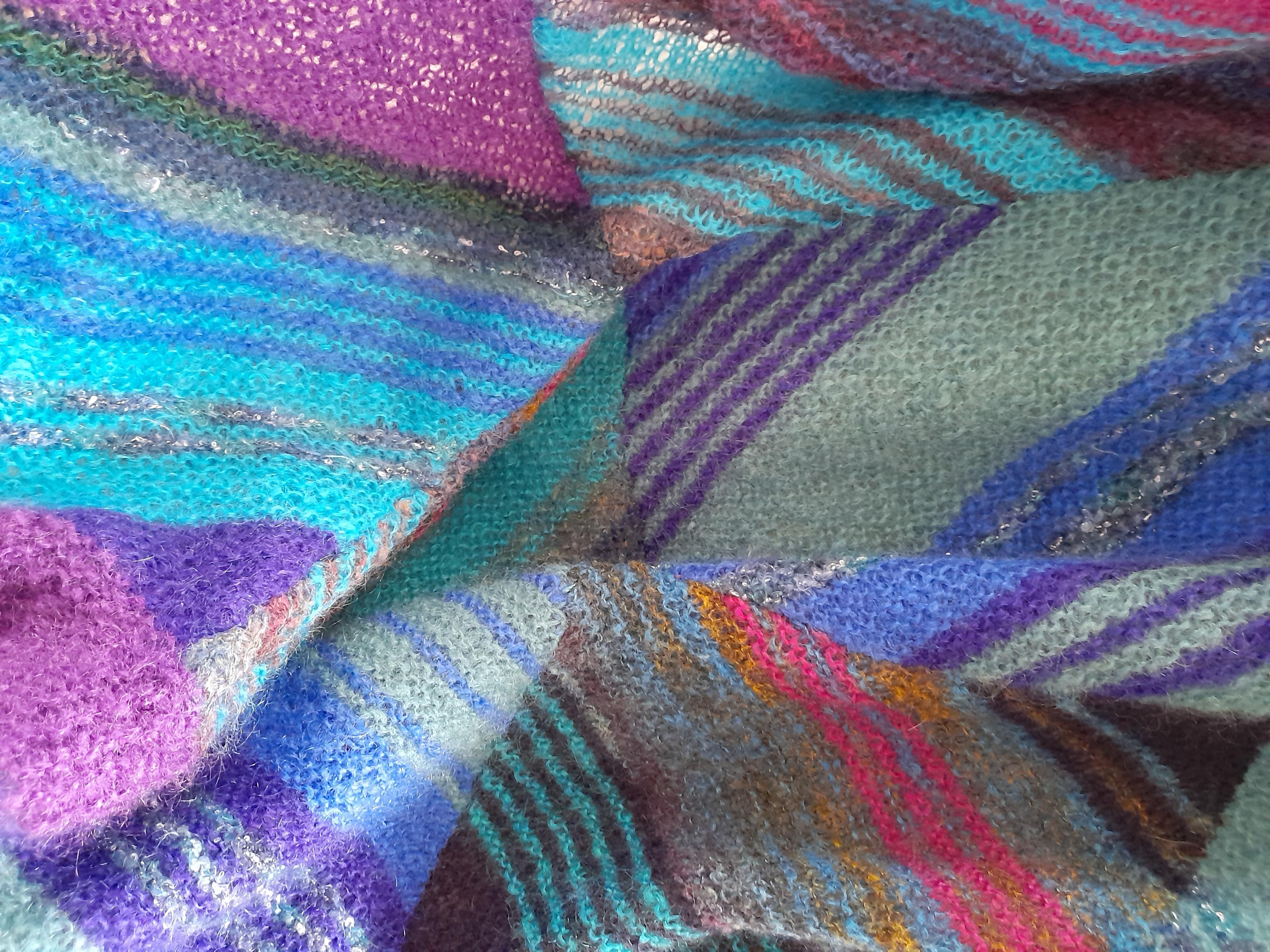 Ann Faulkner, the group leader, is the author of the two pictures on this web page. The top picture is a collage of several of Ann's designs using crochet as well as knittings. The bottom is a mohair throw made from several squares knitted separately and sewn together. The stripes use toning colours from Ann's mohair stash and were designed using the Fibonacci sequence.