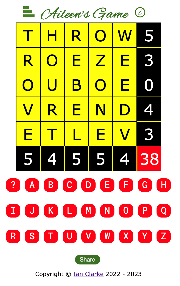 Once you have placed the last letter into the grid your game will automatically be scored and a green ‘Share’ button will appear below the Alphabet Buttons.