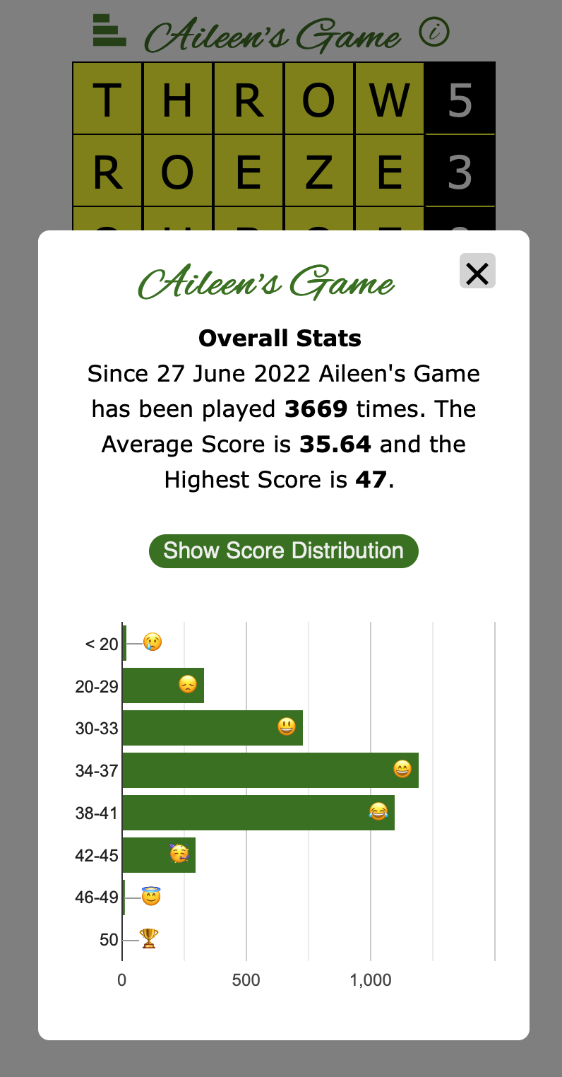 This screen tells you how many times the game has been played, the overall average score and the highest ever score since the given date. When you click/tap the ‘Show Score Distribution’ button you can see the distribution of all the scores by emoji group.