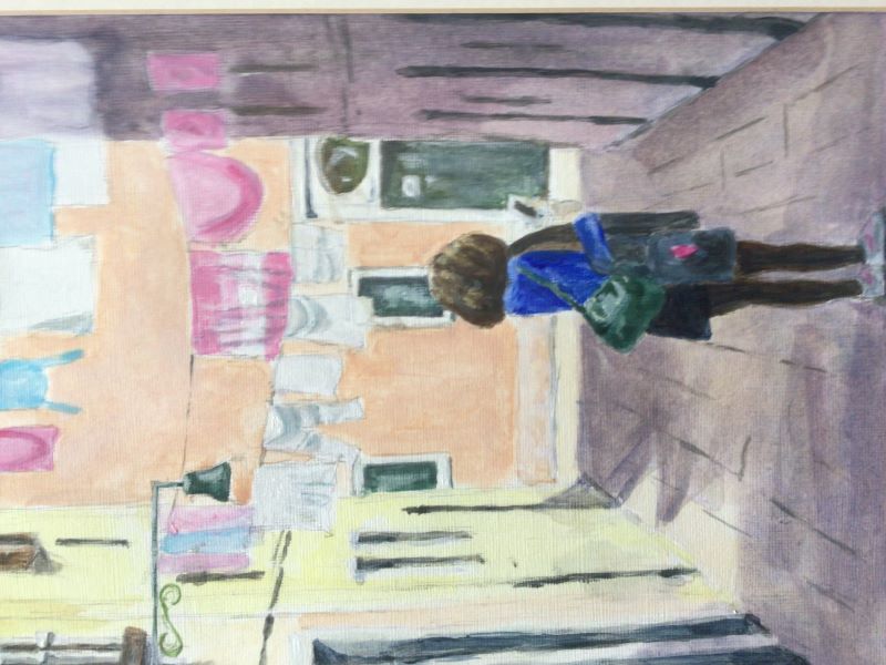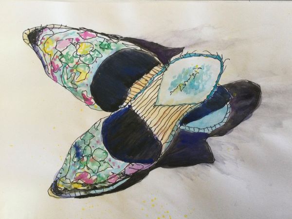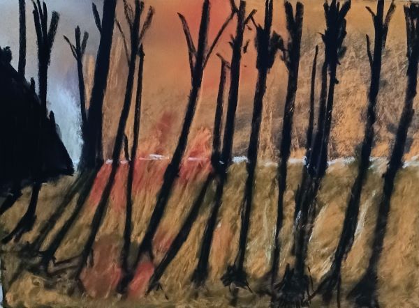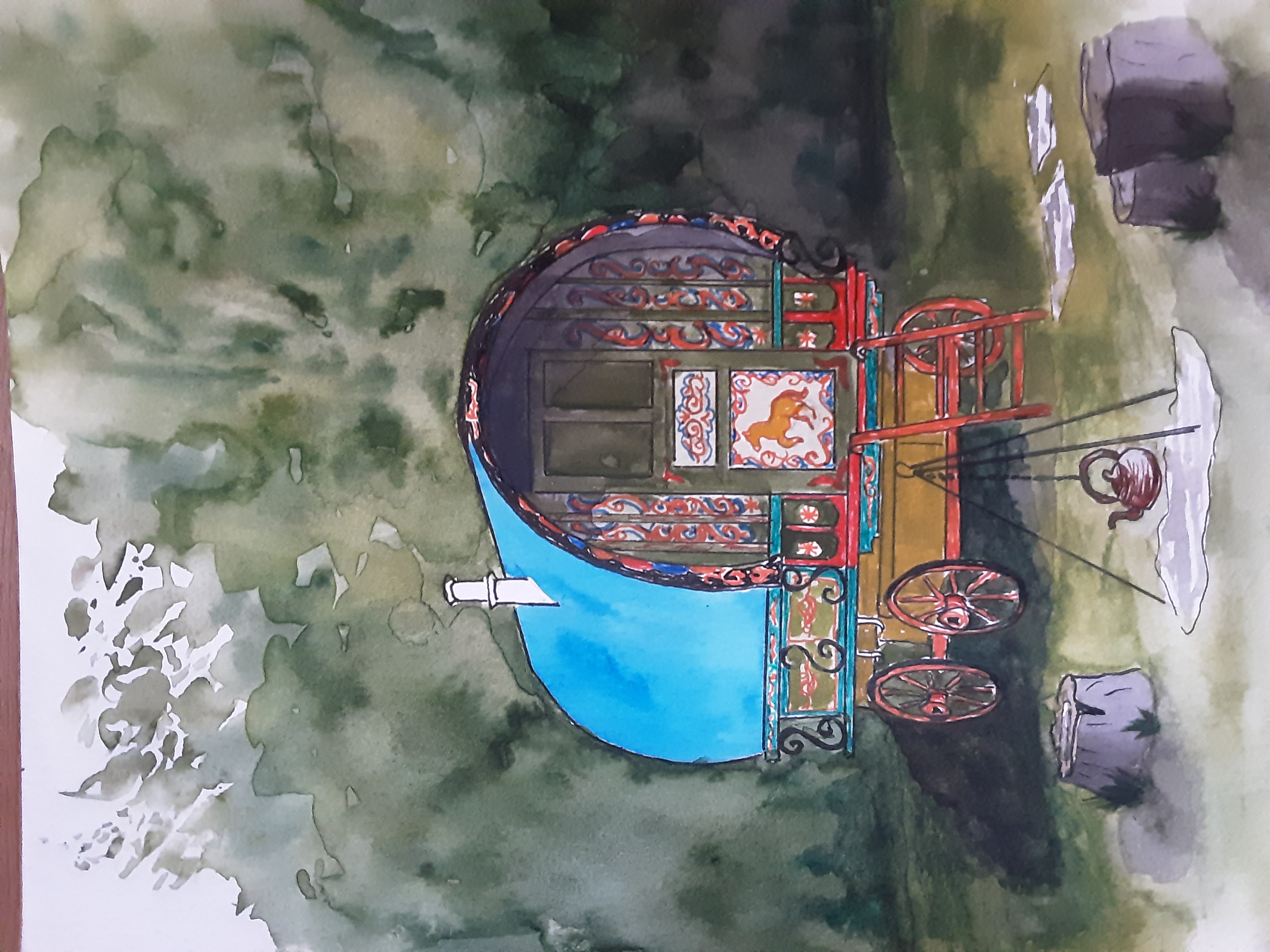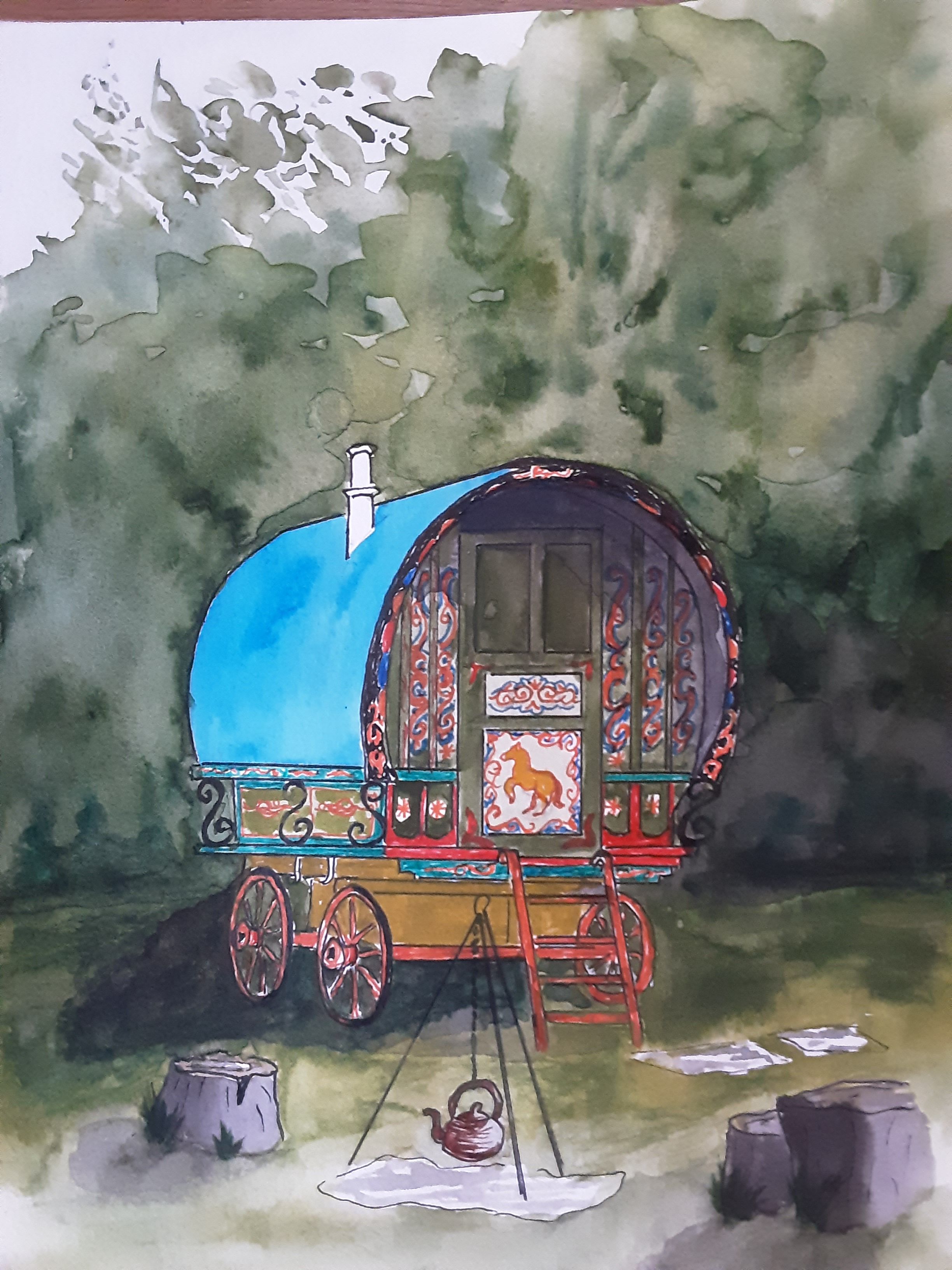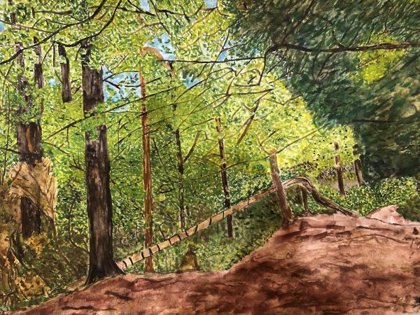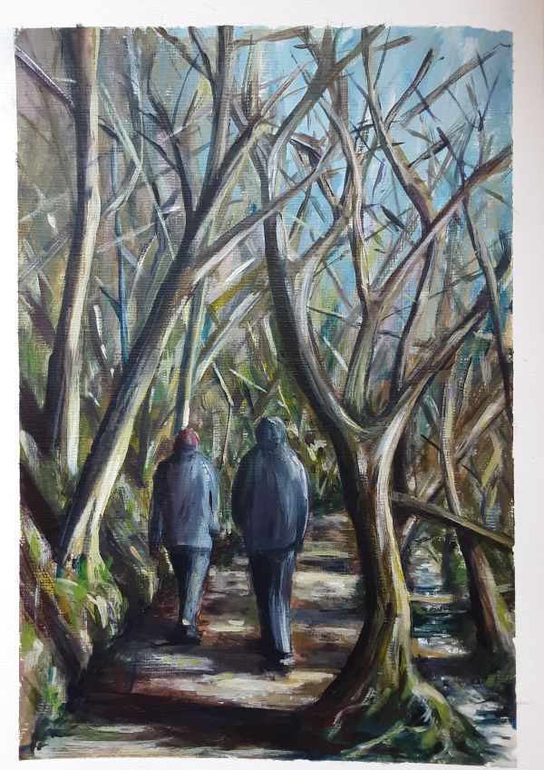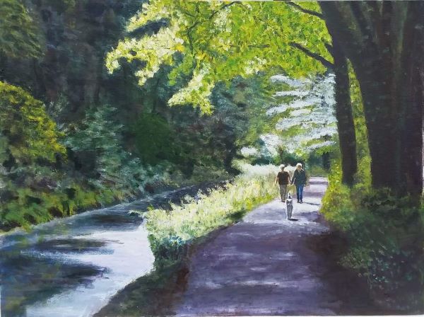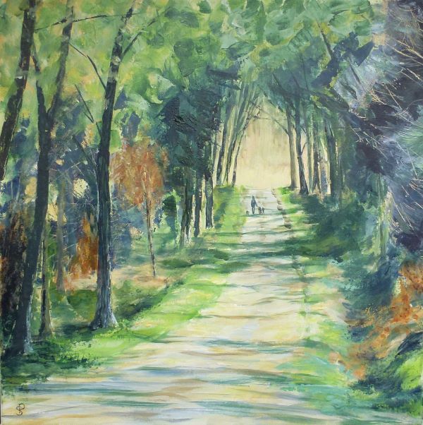 This woodland track is on a favourite walk, and I spotted another walker and her dogs ahead of me. On a sunny day the shadows of the trees form lines across the path, and I enjoyed painting the contrasts between the bright sunlit colours and the shadows.