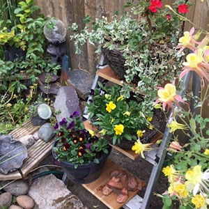 Shirley and David from Marple Bridge and Mellor U3A also caught the upcycling bug. In a lockdown clear out they found a pair of old step ladders. They decided to use them to display planters in the garden, cutting them in half and replacing the steps with the shelves of an old bookcase to make them wide enough to hold the plants.